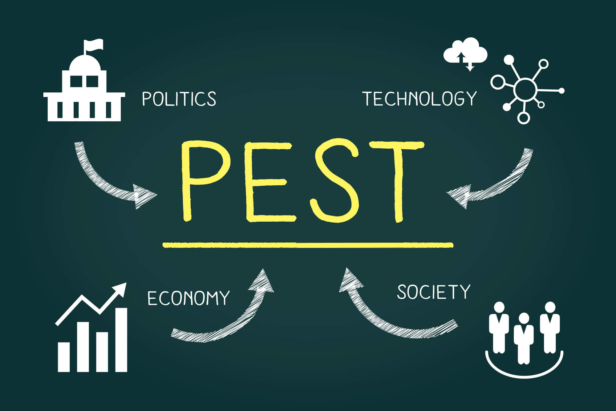 PEST分析は、「Politic(政治)」「Economy(経済)」「Society(社会)」「Technology(技術)」という4つの軸で、ビジネスの外部環境に関する情報収集の分析を行うマーケティングフレームワークです。WEBマーケティングに取り組みたい、新規事業を立ち上げたいと思ったら、まずはPEST分析で外部環境を分析します。